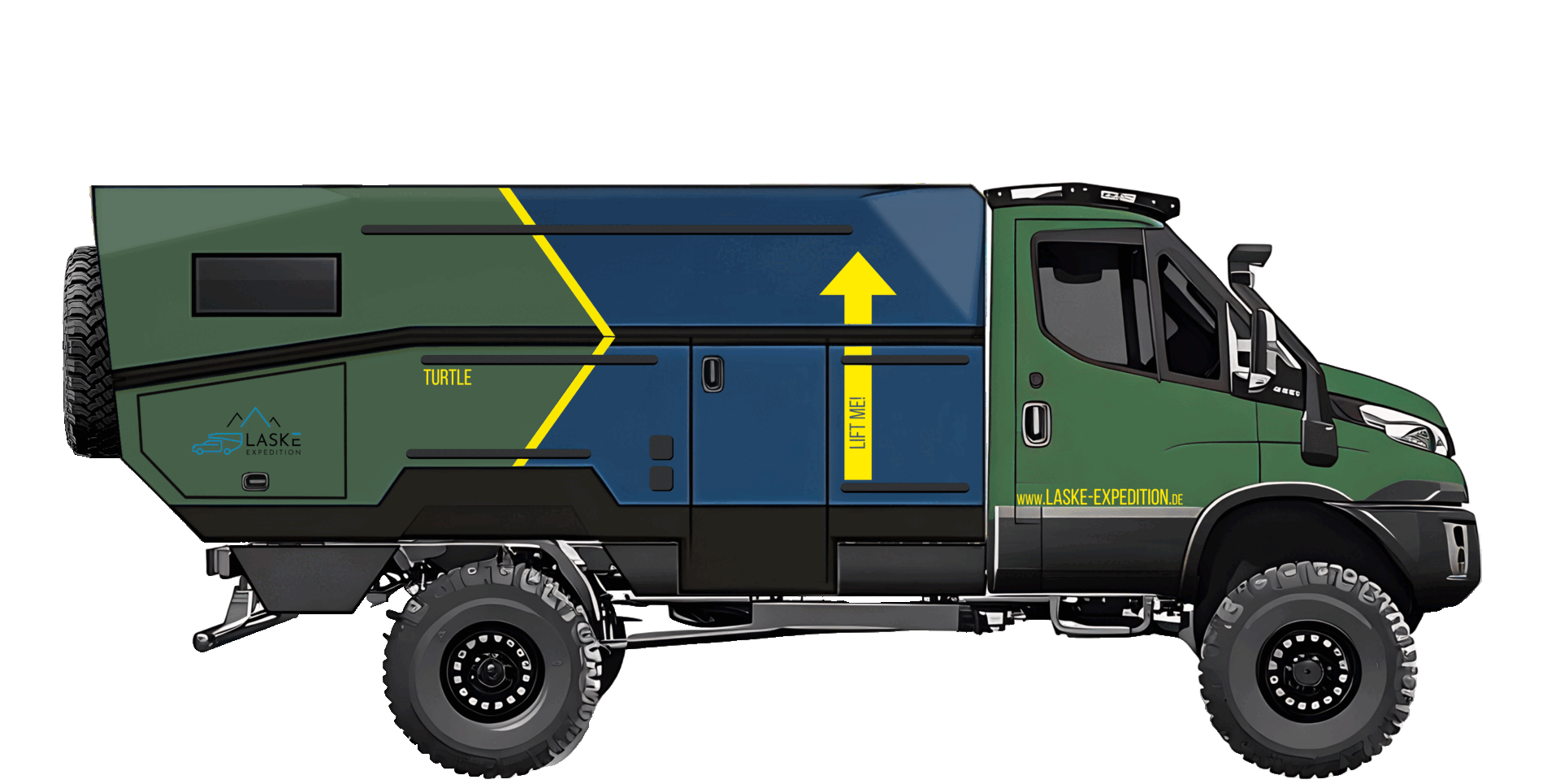 Das zentrale Element aller Laske Expedition-Kabinen ist das patentierte Parallelhubdach. Es vereint kompakte Maße mit einem großzügigen Wohnraum. Z.B. bei einem Pickup als Basisfahrzeug: Bei nur 2,50 m Fahrzeughöhe während der Fahrt sorgt es für verbesserte Stabilität und ermöglicht problemloses Passieren enger Waldwege oder die Verschiffung im Container. Ausgefahren bietet die Kabine 2,20 m Innenraumhöhe für ein geräumiges Wohngefühl, ideal für längere Reisen mit hohem Komfortanspruch.